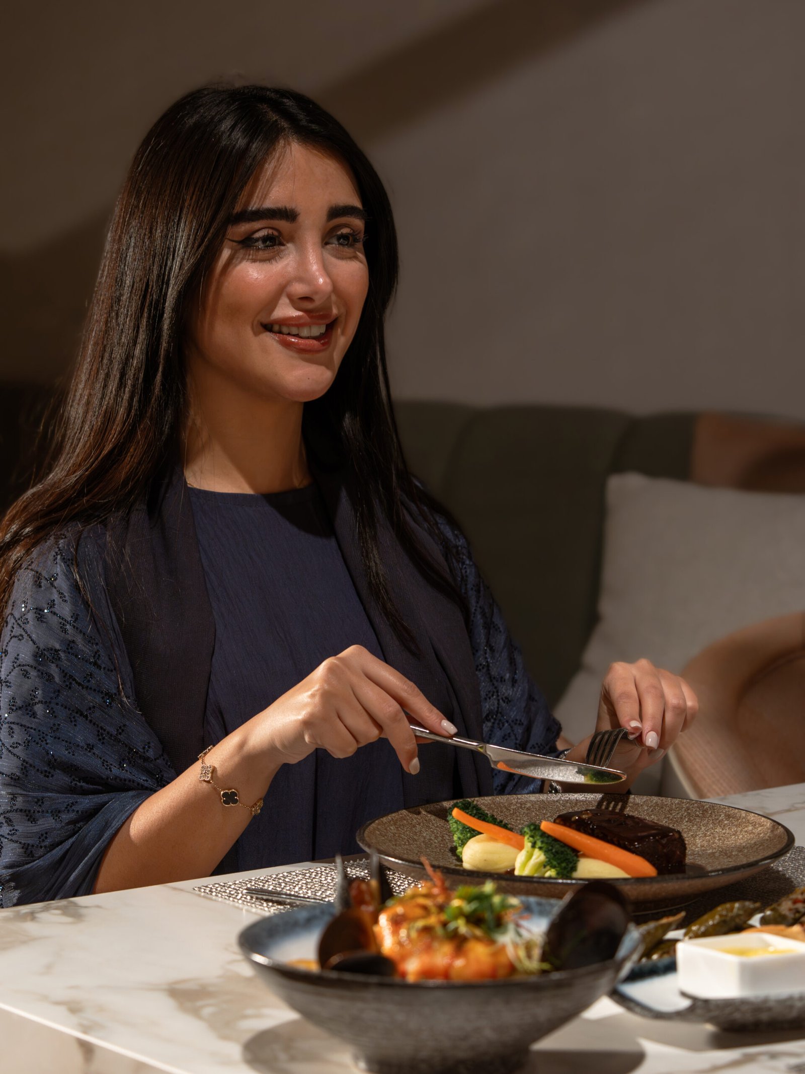 تتحول الإطلالة إلى مشهد نابض بالحياة، حيث تتلألأ أضواء المدينة في الأسفل لتضفي بعداً درامياً على كل لحظة داخل المطعم. كل عنصر، من الخدمة الهادئة إلى التصميم الأنيق، يجسد مفهوماً راقياً للفخامة المتزنة، حيث تسود العناية بالتفاصيل دون تكلف.