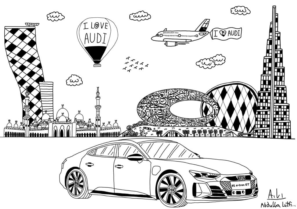 تتألق رؤية عبد الله لطفي الفنية في عالم يفصح عن جماله من خلال الخطوط والألوان ليعكس رؤية أودي في عالم السيارات والتي تلتقي مع رؤية عبد الله للجمال في المناظر الطبيعية الخلّابة التي يعبّر عنها في لوحاته.