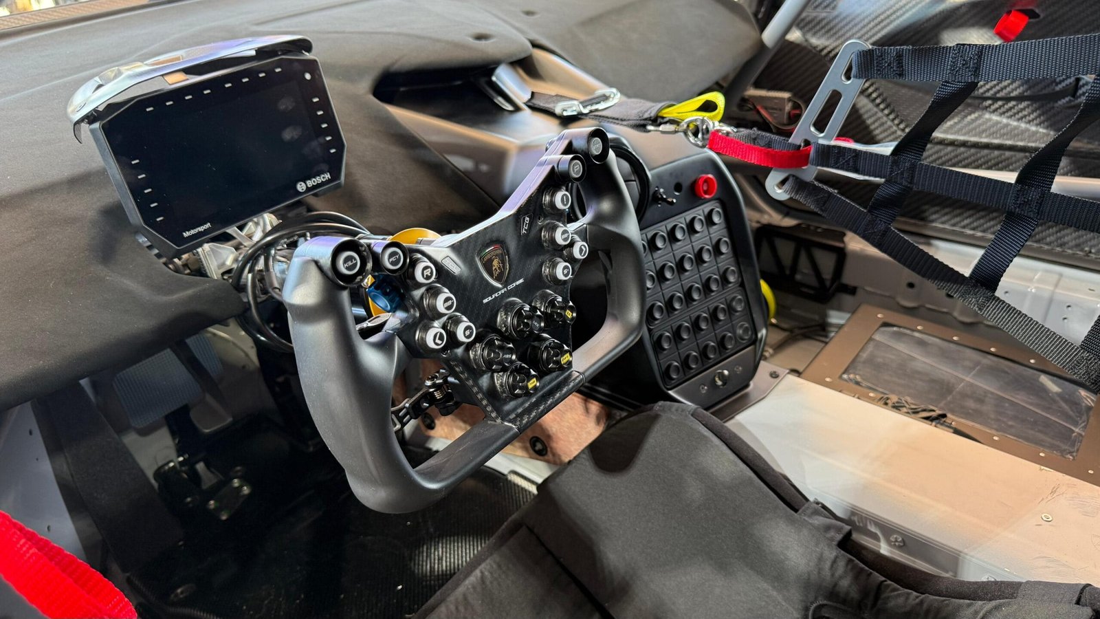 أما في المقصورة، فتم تحسين بيئة القيادة بالتعاون مع سائقي الاختبارات ماركو مابيلي وأندريا كالداريللي، لضمان أفضل وضعية وتحكم. تمت إعادة تصميم لوحة العدادات وتحديث الشاشات الرسومية لتوفير بيانات دقيقة للسائقين. كما أضيفت مفاتيح مخصصة على عجلة القيادة، وتم تطوير الأنظمة الإلكترونية لتلبية متطلبات السباقات عالية الأداء.