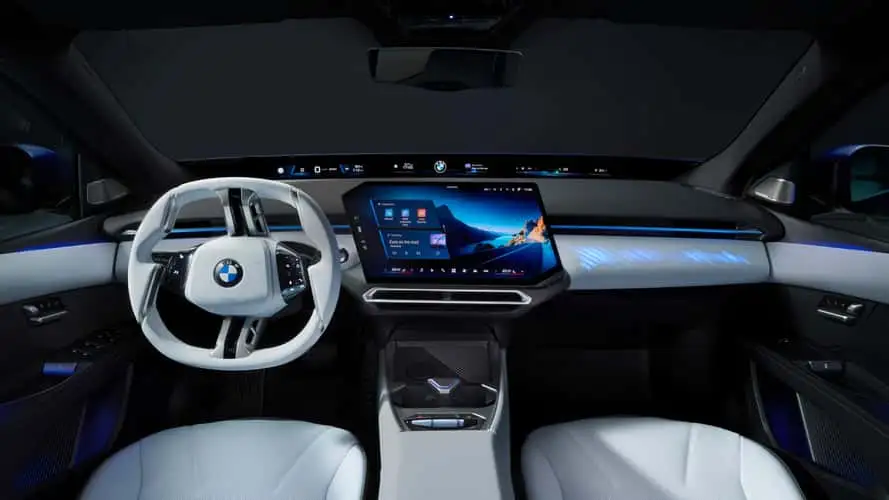 في المقابل، تتبع BMW نهج “التقنية الخفية” الذي يُخفي الميزات التقنية حتى تحتاجها فعلاً. تعتمد i3 على شاشة مركزية بشكل متوازي الأضلاع بحجم 17.9 إنش تستحضر تصاميم BMW الكلاسيكية. فضلاً عن ذلك، تتميز i3 بشاشة بانورامية بعرض 43 إنش على الحافة السفلية للزجاج الأمامي. وبالتالي، تُشكّل هذه الشاشة نظاماً هجيناً بين الشاشة التقليدية والعرض المعلوماتي أمام السائق مباشرةً.