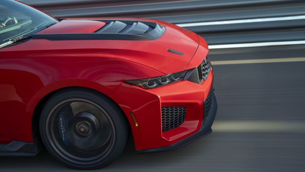 لم تكتفِ فورد بزيادة القوة في موستانج دارك هورس SC. بل أعادت هندسة الهيكل بالكامل لتحمّل الاستخدام الشرس على الحلبات. أولاً، يأتي غطاء المحرك مصنوعاً من الألمنيوم الخفيف الوزن. ثانياً، تُضيف فتحة تهوية من ألياف الكاربون ضغطاً سفلياً Downforce أعلى بمرتين ونصف من النسخة العادية. ثالثاً، شملت التحسينات تبريداً شاملاً يضمن تدفق الأداء تحت ضغط الحلبة. علاوةً على ذلك، تحصل جميع الفئات على نظام تعليق Magnetorheological المتطور. كذلك يتوفر نظام تحكم متغير بالتماسك لتعزيز الاستقرار والديناميكيات في أقسى الظروف. وبالتالي، تبدو SC وكأنها GT3 بلوحة أرقام مدنية.