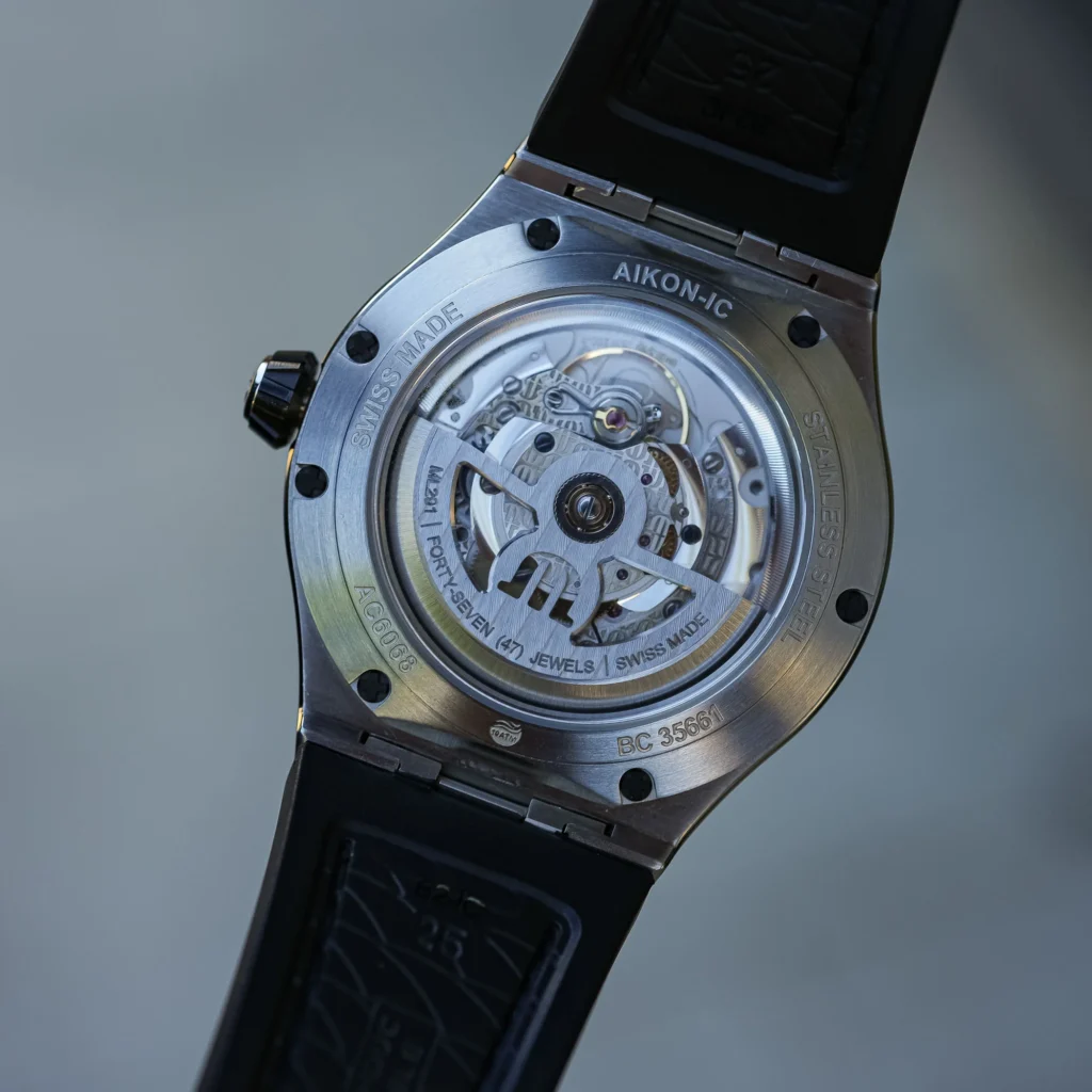 This design approach gives the watch a technical, instrument-like appearance that stands apart from most traditional Swiss watches.
