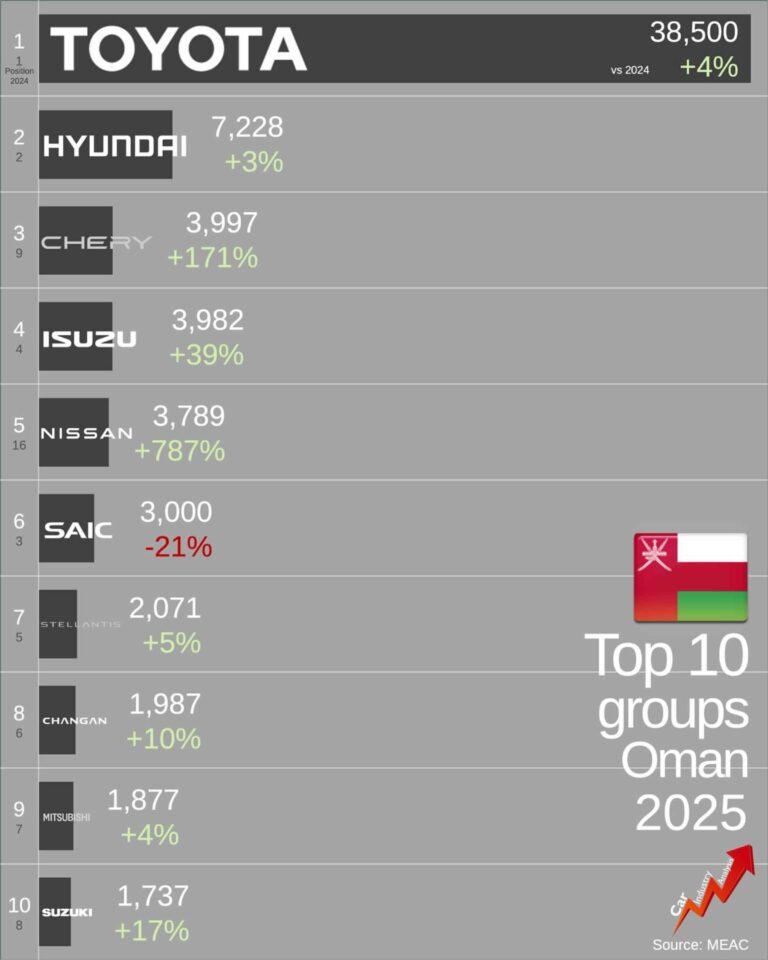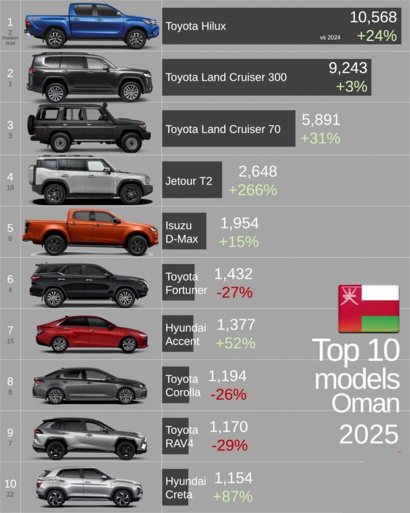 The 2025 sales figures in Oman tell a story of transition. While legacy brands like Toyota continue to dominate, cracks are beginning to show in certain segments. At the same time, new players are rising quickly, challenging long-standing norms.
